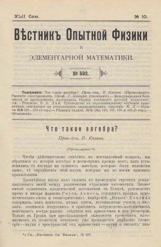 Каганъ В. Что такое алгебра? (Стр. 225—231. Начало в выпуске № 498, cтр. 121—127. Продолжение в выпусках № 503—504, cтр. 258—268; № 507, cтр. 57—63)●
