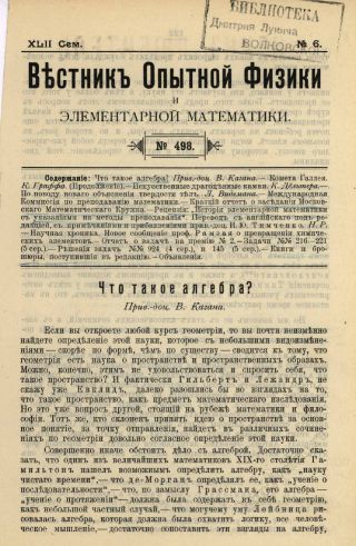 Каганъ В. Что такое алгебра? (Стр. 121—127. Продолжение в выпусках № 502, cтр. 225—231; № 503—504, cтр. 258—268; № 507, cтр. 57—63)●